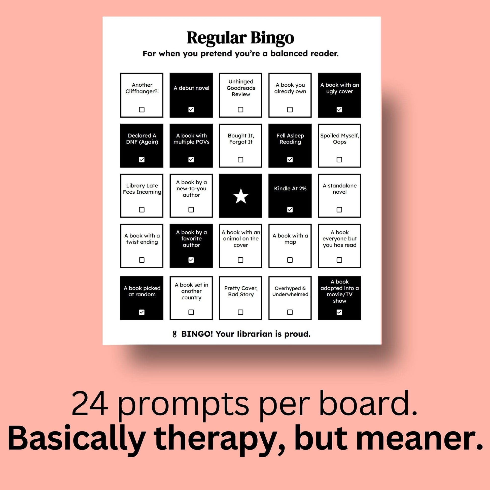 Comes with 10 themed boards (Fantasy, Spicy, Horror, Cozy, YA, Sci-Fi, Crime, Classics, Unhinged, and more), plus a Help PDF if you've never played bingo. Digital, reusable, and guaranteed to roast you harder than your group chat.
