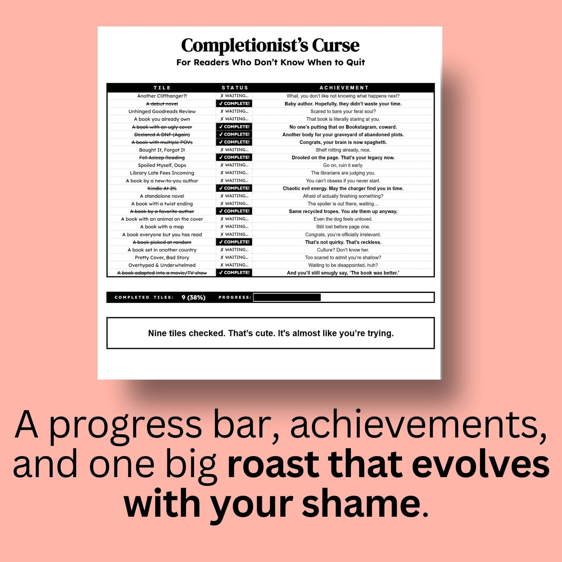 A Google Sheets bingo game for readers who think TBRs are a competitive sport. Each board has 24 prompts, instant roast feedback, and a Completionist’s Curse mode with progress bars and global shame.