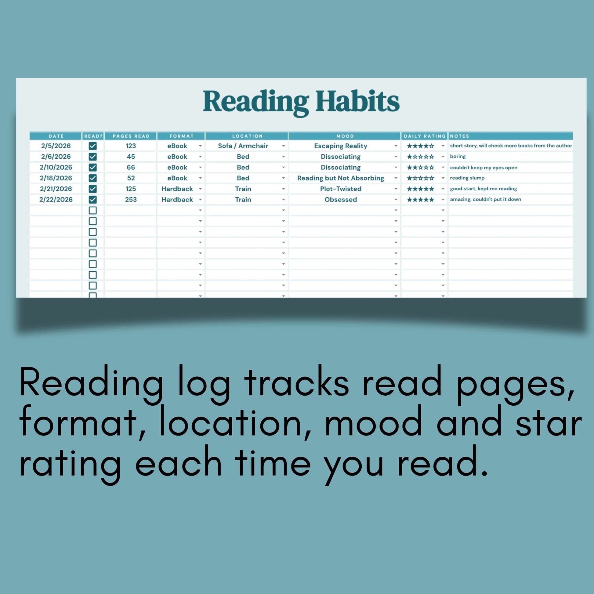 A Google Sheets habit tracker that sees everything. Log pages, formats, moods, ratings, and get roasted with stats and sarcastic commentary. Comes with a 10-year calendar, because your delusion is long-term.
