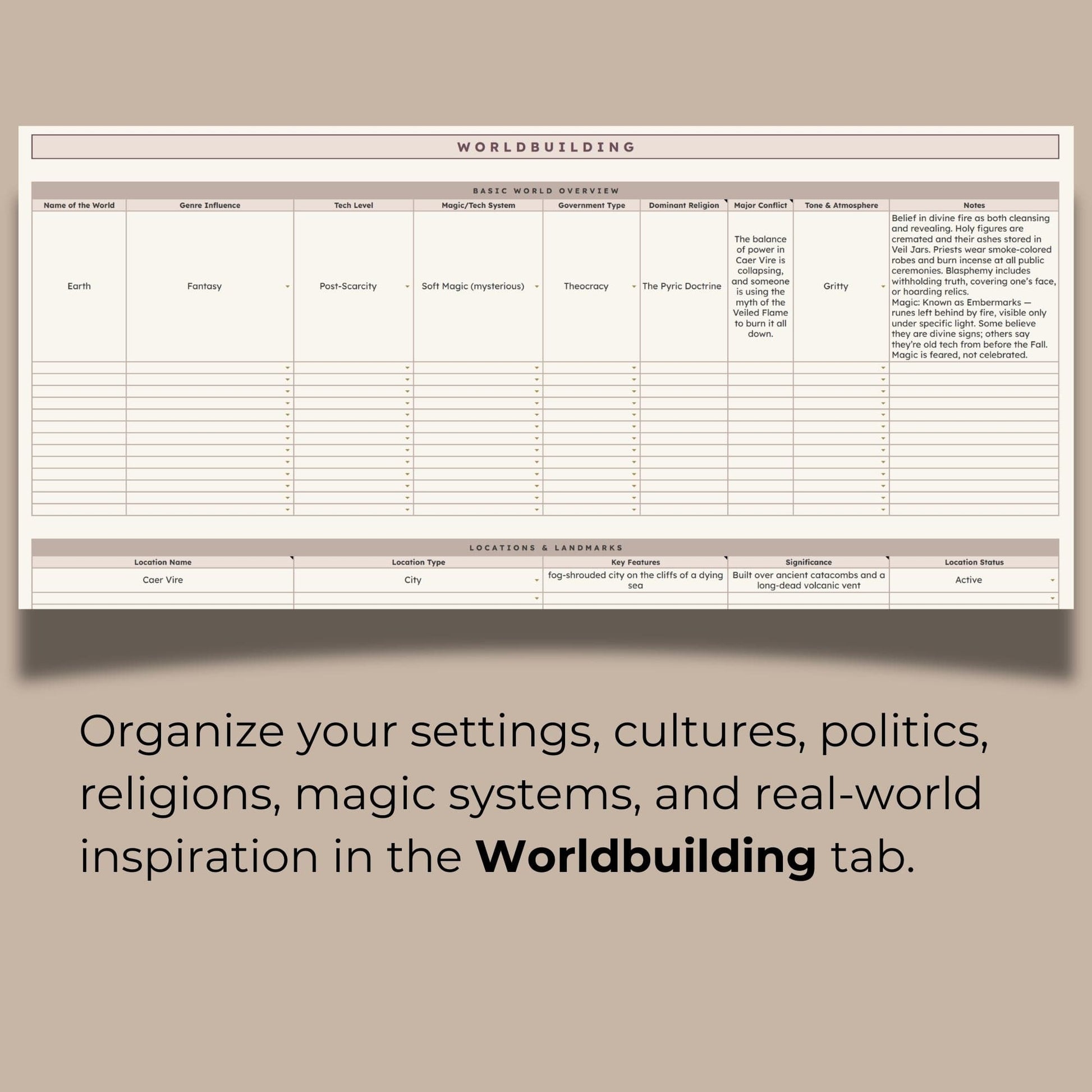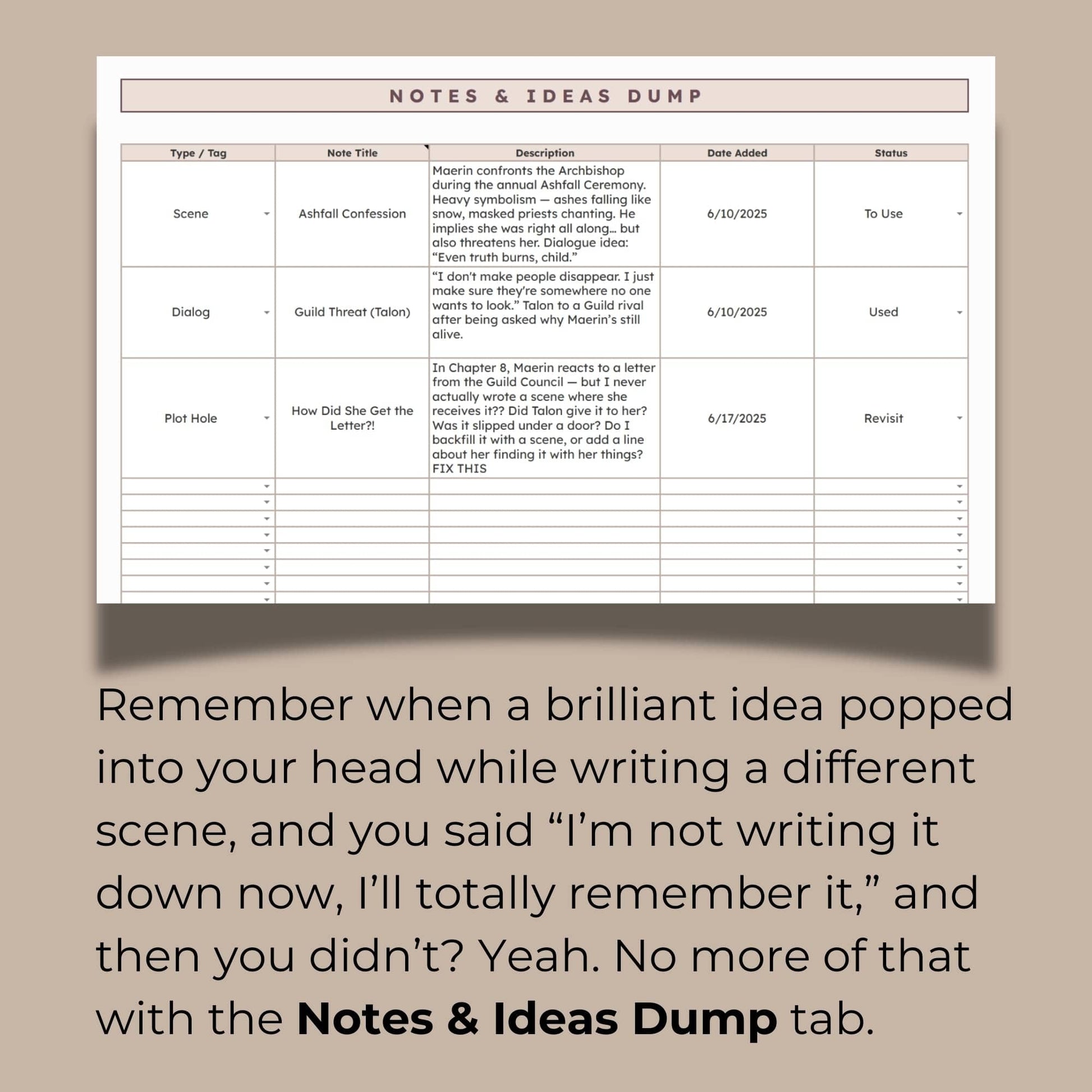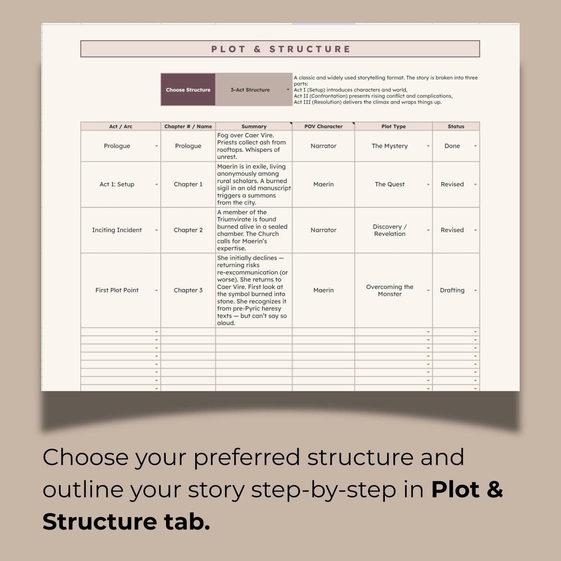 A Google Sheets planner that takes your project from messy idea to finished draft. Track word counts, map plots, build worlds, profile characters, and dump notes - all in one aesthetic, reusable spreadsheet. Comes with 5 alternate themes, because your spreadsheet should match your current breakdown.