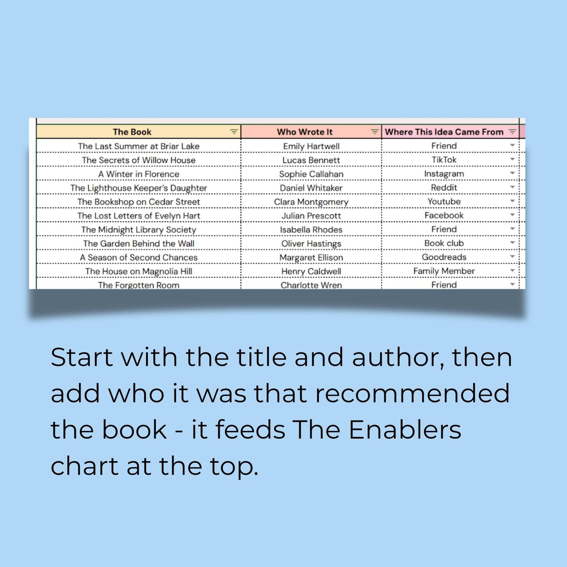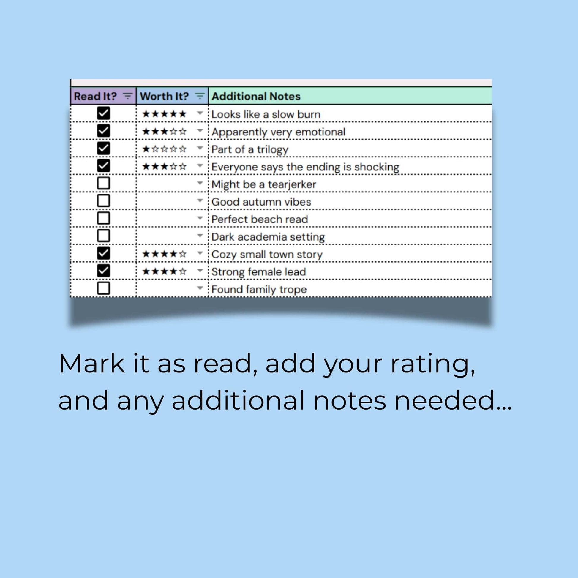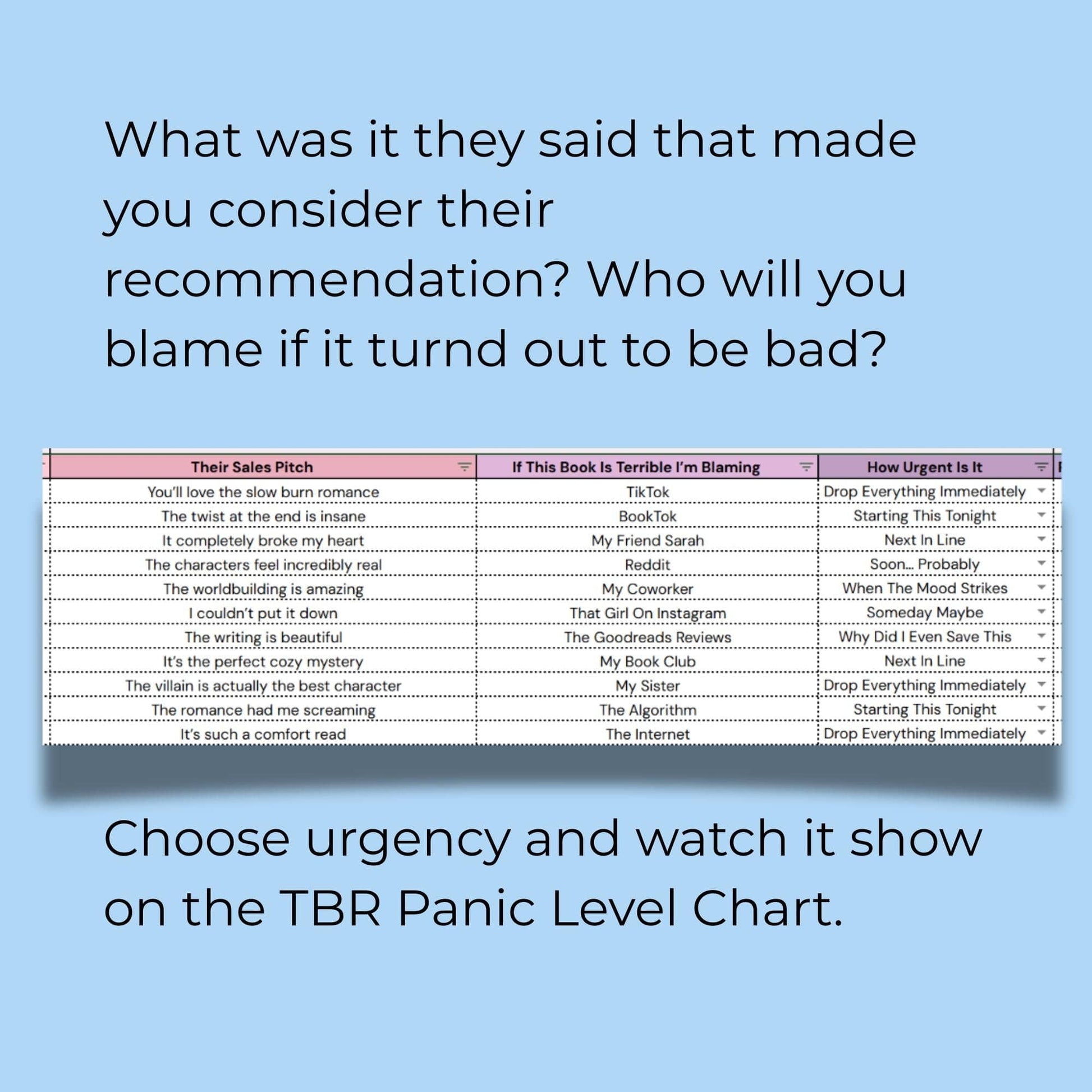 Hype vs. Reality Tracker is a Google Sheets tracker for books everyone swore you’d love. Log recommendations, track where the hype came from, rate the reality, and see who keeps filling your TBR with questionable advice.